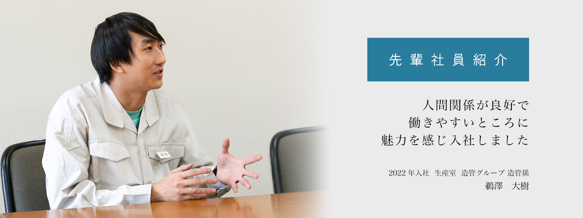 当社は人間関係が良好で、さらに残業時間がしっかり管理されていて働きやすいところに魅力を感じて、入社する事にしました。